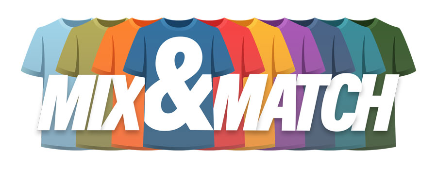 Select any number of styles with any mix of sizes and quantities from the mix and match range including T-Shirts & Hoodies.
